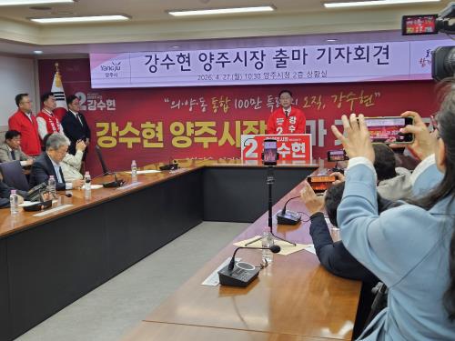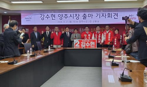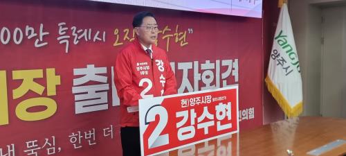 °¼öÇö ½ÃÀåÀº 4¿ù27ÀÏ ¾çÁÖ½Ãû »óȲ½Ç¿¡¼ Ã⸶ ±âÀÚȸ°ßÀ» ¿¾î À̰°ÀÌ ¹àÈ÷°í Àç¼± µµÀüÀ» °ø½Ä ¼±¾ðÇß´Ù. ±âÀÚȸ°ß¿¡ ¾Õ¼ ¼±°üÀ§¸¦ ¹æ¹®ÇØ ¿¹ºñÈ帷Πµî·ÏÇÑ µÚ ±¹¹ÎÀÇÈû ½Ã·µµÀÇ¿ø Èĺ¸ ¹× ÁöÁöÀÚ µî 200¿©¸í°ú ÇöÃæÅ¾À» Âü¹èÇϰí ÇʽÂÀ» ´ÙÁüÇß´Ù.