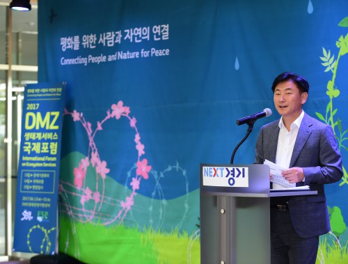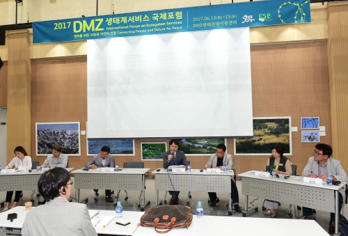 ±¹³»¿Ü ¼®ÇеéÀÌ º¸¿© DMZ »ýÅÂ°è º¸ÀüÀÇ ¹Ì·¡¸¦ °í¹ÎÇØº¸´Â ‘2017 DMZ »ýŰ輺ñ½º ±¹Á¦Æ÷·³’ º»È¸Àǰ¡ 14ÀÏ ¿ÀÀü 10½Ã °³È¸½ÄÀ» ½ÃÀÛÀ¸·Î ¼ºÈ²¸®¿¡ ¿·È´Ù.