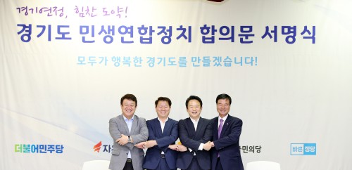 ³²°æÇÊ °æ±âµµÁö»ç¿Í °æ±âµµÀÇȸ ´õºÒ¾î¹ÎÁÖ´ç ¹Ú½Â¿ø ´ëÇ¥, ÀÚÀ¯Çѱ¹´ç ÃÖÈ£ ´ëÇ¥, ±¹¹Î¹Ù¸¥¿¬ÇÕ ÃÖÃá½Ä ´ëÇ¥´Â 11ÀÏ °æ±âµµÀÇȸ ´ëȸÀǽǿ¡¼ °æ±âµµ ¹Î»ý¿¬ÇÕÁ¤Ä¡ ÇÕÀǹ®¿¡ ¼¸íÇϰí, °æ±âµµ 乫 Á¦·ÎÈ ¼±¾ð µî 3°³Ç×À» ¹ßÇ¥Çß´Ù.