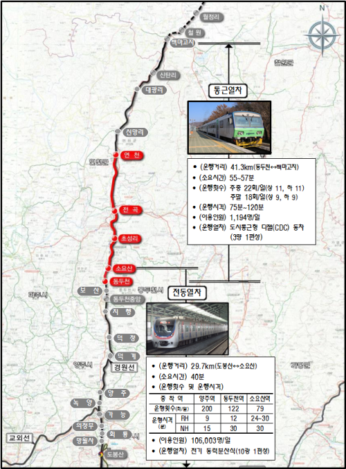 ÇöÀç °æ¿ø¼± ÀüöÀº ¼¿ïÀ» °ÅÃÄ ÀÇÁ¤ºÎ, ¾çÁÖ, µ¿µÎõ±îÁö ¿îÇàµÇ°í ÀÖÀ¸¸ç µ¿µÎõ¿¡ µµÂøÇÏ´Â ÀüöÀº ÇÏ·ç 66ȸ, 132ȸ¿¡ ´ÞÇÑ´Ù.