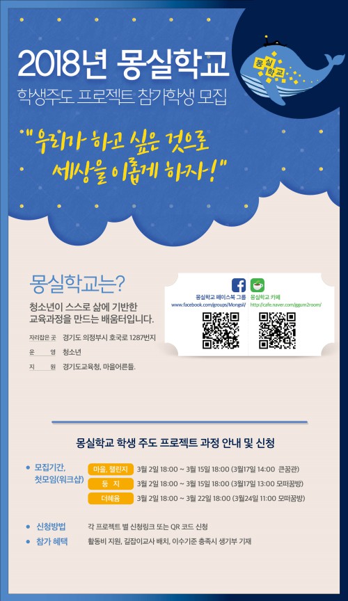 À̹ø °úÁ¤Àº ÇлýµéÀÌ »î¿¡ ±â¹ÝÀ» µÐ ±³À°°úÁ¤À» Á÷Á¢ ¸¸µé°í ½ÇÇàÇÒ ¼ö ÀÖµµ·Ï Çϱâ À§ÇÑ °ÍÀ¸·Î ¸¶À»(ޱ¸, üÇè, À¶ÇÕ) ÇÁ·ÎÁ§Æ®¿Í 縰Áö ÇÁ·ÎÁ§Æ®, ´õÇýÀ³ ÇÁ·ÎÁ§Æ®, µÕÁö(Ãʵî Àü¹®) ÇÁ·ÎÁ§Æ®, ¸ù½Ç °øµ¿Ã¼ ÇÁ·ÎÁ§Æ® ºÐ¾ß·Î ³ª´©¾î ¸ðÁýÇÑ´Ù.
