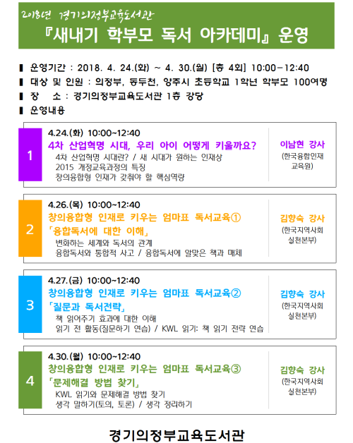 4¿ù26ÀÏ, 27ÀÏ, 30ÀÏ¿¡´Â Çѱ¹Áö¿ª»çȸ½Çõº»ºÎ ±èÇâ¼÷ °»ç°¡‘âÀÇÀ¶ÇÕÇü ÀÎÀç·Î Ű¿ì´Â ¾ö¸¶Ç¥ µ¶¼±³À°’À» ÁÖÁ¦·Î ¡ãÅëÇÕÀû »ç°í·Â Çâ»óÀ» À§ÇÑ À¶ÇÕµ¶¼, ¡ãÁú¹®°ú µ¶¼Àü·«, ¡ãµ¶¼¸¦ ÅëÇÑ ¹®Á¦ÇØ°á ¹æ¹ý ã±â µî °¡Á¤¿¡¼ ½ÇÁ¦ Àû¿ëÇÒ ¼ö ÀÖ´Â ÀÚ³à µ¶¼Áöµµ ¹æ¹ý¿¡ ´ëÇØ 3ȸ¿¡ °ÉÃÄ °ÀÇÇÑ´Ù.