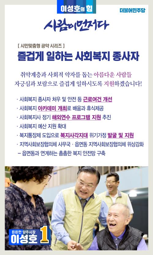 À̼ºÈ£(60) ´õºÒ¾î¹ÎÁÖ´ç ¾çÁÖ½ÃÀå È帴 6¿ù8ÀÏ ‘À̼ºÈ£ÀÇ Èû, »ç¶÷ÀÌ ¸ÕÀú´Ù’¶ó´Â ½Ã¹Î ¸ÂÃãÇü °ø¾à ¼¼ ¹øÂ° ½Ã¸®Áî·Î »çȸº¹Áö Á¾»çÀÚ¿¡ ´ëÇÑ Á¤Ã¥À» ³»³õ¾Ò´Ù.