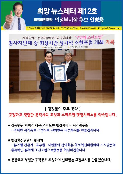 ¾Èº´¿ë(62) ´õºÒ¾î¹ÎÁÖ´ç ÀÇÁ¤ºÎ½ÃÀå È帴 6¿ù11ÀÏ Èñ¸Á´º½º·¹ÅÍ Á¦12È£¸¦ ÅëÇØ °øÁ¤Çϰí û·ÅÇÑ °øÁ÷»çȸ Á¶¼º°ú ½º¸¶Æ®ÇÑ ÇàÁ¤¼ºñ½º¸¦ ¾à¼ÓÇÏ´Â ÇàÁ¤ ºÐ¾ß ÁÖ¿ä °ø¾àÀ» ¹ßÇ¥Çß´Ù.