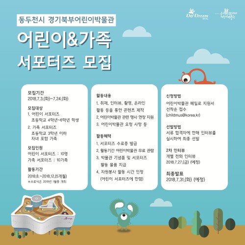¼Æ÷ÅÍÁîÀÇ È°µ¿Àº ¹Ú¹°°ü ȨÆäÀÌÁö ¼Æ÷ÅÍÁî ´º½º·¹Å͸¦ ÅëÇØ È®ÀÎÇÒ ¼ö ÀÖ´Ù. ±âŸ ¼Æ÷ÅÍÁî ¸ðÁý°ú °ü·ÃÇÑ ³»¿ëÀº °æ±âºÏºÎ¾î¸°À̹ڹ°°ü ȨÆäÀÌÁö(http://childmus.ddc.go.kr) ¶Ç´Â ¾î¸°À̹ڹ°°ü SNS¸¦ Âü°íÇÏ¸é µÈ´Ù.
