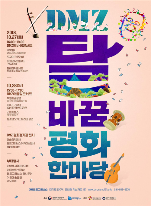 ¸ÕÀú 27ÀÏ¿¡´Â ¹®Ã¼ºÎ¿Í Çѱ¹°ü±¤°ø»ç ÁÖÃÖ·Î ‘DMZ Å»¹Ù²Þ ÄܼƮ’°¡ ÁøÇàµÇ¸ç, DMZÀÇ Ç³°æÀ» ¿µ»ó°ú ¼Ò¸® À½¾ÇÀ¸·Î º¸¿©ÁÖ´Â ¹Ìµð¾î °ø¿¬ ‘DMZ »ç¿îµå ½ºÄÉÀÌÇÁ’, ¾ç±Ý°ú ÄÜÆ®¶óº£À̽º¸¦ ¹ÙÅÁÀ¸·Î ¿ì¸® ¼Ò¸®¸¦ ÀçÇØ¼®ÇÑ ‘°³¸· ¹Î¿ä°ø¿¬’, ÆòÈÀÇ ½Ã ³¶¼Û µîÀ¸·Î ÃàÁ¦ÀÇ ½ÃÀÛÀ» ¾Ë¸°´Ù.