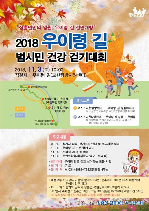 À̳¯ Çà»ç´Â ¿ìÀÌ·É ±æÀ» ÇÔ²² °È±â ¿øÇÏ´Â ´©±¸³ª ¹«·á·Î Âü¿©ÇÒ ¼ö ÀÖÀ¸¸ç ¿ÀÀü 9½Ã 40ºÐ ÀåÈï¸é ±³Çö¸® ¿ìÀÌ·É ±æ ÀÔ±¸ ±³Çö޹æÁö¿ø¼¾ÅÍ¿¡ ¸ð¿© 2°³ ÄÚ½º·Î ÁøÇàÇÑ´Ù.