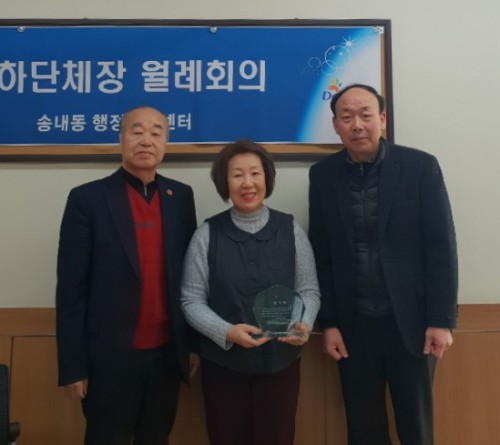 À̳¯Àº 2³â°£ ¼Û³»µ¿ ÅëÀåÇùÀÇȸÀåÀ» ¿ªÀÓÇÑ ±èÁ¤Èñ îñ ÅëÀåÇùÀÇȸÀåÀÌ µ¿Á¤ ¹ßÀüÀ» À§ÇØ Çå½ÅÀûÀÎ ³ë·ÂÀ¸·Î ´Üü ÈÇÕ°ú ¼Û³»µ¿ ¹ßÀüÀ» À̲ö °Í¿¡ ´ëÇØ °¨»çÀÇ ¶æÀ» Ç¥ÇÏ´Â °¨»çÆÐ¸¦ Àü´ÞÀÇ ½Ã°£À» °¡Á³´Ù.