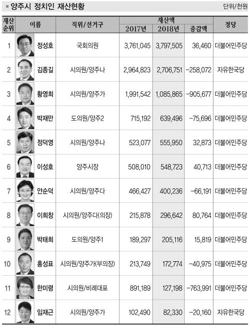 ¾çÁֽà Á¤Ä¡ÀÎ Áß Àç»ê¼øÀ§ 5À§¿¡ ¿À¸¥ Á¤´ö¿µ ¾çÁÖ½ÃÀÇ¿øÀÇ 2018³â Àç»ê ½Å°í¾×Àº 2017³âº¸´Ù 3õ287¸¸¿ø Áõ°¡ÇÑ 5¾ï5õ595¸¸¿øÀÌ´Ù. ±×·¯³ª Á¤ÀÛ Á¤ ÀÇ¿ø ¸íÀÇÀÇ Àç»êÀº ¸¶À̳ʽº·Î ³ªÅ¸³µ´Ù. Á¤ ÀÇ¿øÀº ¶Ç ½Â¿ëÂ÷¸¦ ºÎÀΰú Àå³² °øµ¿¸íÀÇ·Î µî·ÏÇØ ³õ°í Ÿ°í ´Ù´Ñ´Ù.