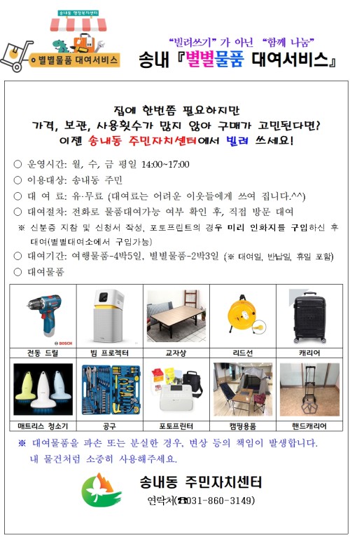 µ¿µÎõ½Ã ¼Û³»µ¿ ÁÖ¹ÎÀÚÄ¡¼¾ÅÍ(À§¿øÀå Àå¹Î°æ)¿¡¼´Â ¿À´Â 8¿ùºÎÅÍ ¼Û³»µ¿ ÇàÁ¤º¹Áö¼¾ÅÍ ÁÖ¹ÎÀÚÄ¡ ¼ö°½Ç Âü²É¸¶¸®¿¡¼ 'º°º°¹°Ç° ´ë¿©¼ºñ½º'¸¦ ½Ç½ÃÇÑ´Ù.