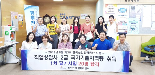 µ¿µÎõ½Ã ÀÏÀÚ¸®¼¾ÅÍ¿¡¼´Â Çѱ¹»ê¾÷Àη°ø´Ü¿¡¼ ½ÃÇàÇÑ 2019³â Á¦3ȸ Á÷¾÷»ó´ã»ç 2±Þ ±¹°¡±â¼úÀÚ°Ý Çʱâ½ÃÇè¿¡ 35¸íÀÌ ÀÀ½ÃÇÏ¿© 20¸íÀÌ ÇÕ°ÝÇÏ´Â Äè°Å¸¦ ¿Ã·È´Ù.