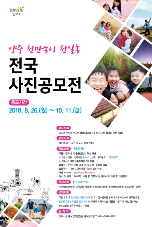 °ø¸ðÀü Âü°¡´Â Àü ±¹¹Î ´©±¸³ª ¾çÁÖ½Ãû ȨÆäÀÌÁö, ¾çÁֽà °ø½Äºí·Î±× ‘Ŭ¸¯¾çÁÖ’¿¡¼ ½Åû¼¸¦ ³»·Á ¹Þ¾Æ »çÁø ¿øº»À» À̸ÞÀÏ(wjsquddla@korea.kr)·Î Á¦ÃâÇØ ½ÅûÇÏ¸é µÈ´Ù.