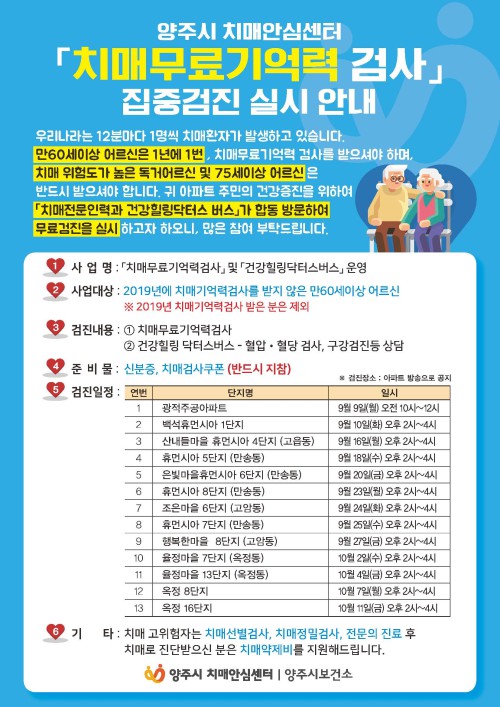 °ËÁø´ë»óÀº 2019³â Ä¡¸Å±â¾ï·Â°Ë»ç¸¦ ¹ÞÁö ¾ÊÀº °ø°øÀÓ´ë¾ÆÆÄÆ® °ÅÁÖ ¸¸60¼¼ ÀÌ»ó ¾î¸£½ÅÀ¸·Î °ËÁøÀÏ¿¡ ¸ÂÃç ½ÅºÐÁõ°ú Ä¡¸Å°Ë»çÄíÆùÀ» °¡Áö°í °ËÁøÀå¼Ò¸¦ ¹æ¹®ÇÏ¸é µÈ´Ù.