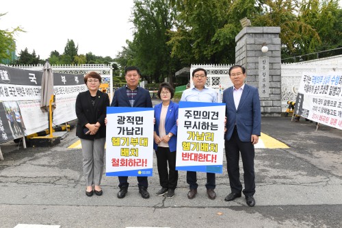 ¾çÁÖ½ÃÀÇȸ(ÀÇÀå ÀÌÈñâ)°¡ 6ÀÏ ±¹¹æºÎ Á¤¹® ¾Õ¿¡¼ ±¤Àû¸é Çï±âºÎ´ë ÀÌÀü ¹èÄ¡¸¦ ¹Ý´ëÇÏ´Â 1ÀÎ ½ÃÀ§¿¡ ³ª¼¹´Ù.