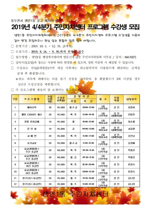 µ¿µÎõ½Ã »ý¿¬1µ¿ ÁÖ¹ÎÀÚÄ¡¼¾ÅÍ¿¡¼´Â ¿À´Â 9¿ù30ÀϱîÁö Áö¿ªÁֹεéÀ» ´ë»óÀ¸·Î 2019³âµµ 4ºÐ±â ÁÖ¹ÎÀÚÄ¡¼¾ÅÍ ÇÁ·Î±×·¥ ¼ö°»ýÀ» ¸ðÁýÇÑ´Ù.