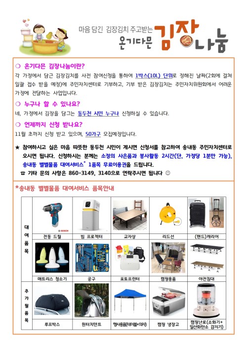 ¼Û³»µ¿ ÁÖ¹ÎÀÚÄ¡À§¿øÈ¸¿¡¼ ½Ç½ÃÇÏ´Â '¿Â±â´Ù¹È ±èÀ峪´®' »ç¾÷Àº °¢ °¡Á¤¿¡¼ ´ã±Ù ±èÀå±èÄ¡¸¦ »çÀü Âü¿© ½ÅûÀ» ÅëÇÏ¿© 1¹Ú½º ´ÜÀ§·Î Á¤ÇØÁø ±â°£¿¡ ÁÖ¹ÎÀÚÄ¡¼¾ÅÍ·Î ±âºÎÇϰí, ±âºÎ¹ÞÀº ±èÀå±èÄ¡´Â ÁÖ¹ÎÀÚÄ¡À§¿øÈ¸¿¡¼ ¾î·Á¿î °¡Á¤¿¡ Àü´ÞÇÏ´Â »ç¾÷À¸·Î, 11¿ù ÃʱîÁö 50°¡±¸ ½ÅûÀ» ¹Þ°í ÀÖÀ¸¸ç, µ¿µÎõ½Ã¹ÎÀÌ¸é ´©±¸³ª °¡´ÉÇÏ´Ù.
