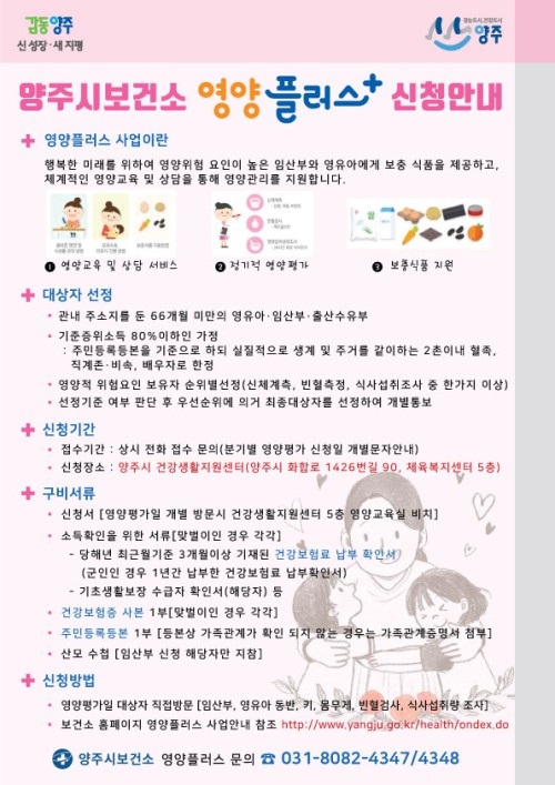 ¾çÁÖ½Ã(½ÃÀå À̼ºÈ£)´Â ÀÓ»êºÎ¿Í ¿µÀ¯¾ÆÀÇ °Ç°°ü¸®¸¦ À§ÇÑ ¿µ¾çÇ÷¯½º »ç¾÷ ´ë»óÀÚ¸¦ »ó½Ã ¸ðÁýÇÑ´Ù.