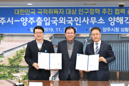 ¾çÁÖ½Ã(½ÃÀå À̼ºÈ£)´Â Áö³ 21ÀÏ ½Ãû »óȲ½Ç¿¡¼ ¾çÁÖÃâÀÔ±¹¿Ü±¹Àλ繫¼Ò(¼ÒÀå ±è¼ö³²)¿Í ´ëÇѹα¹ ±¹Àû ÃëµæÀÚ ´ë»ó Àα¸Á¤Ã¥ ÃßÁø Çù·Â ÁõÁøÀ» À§ÇÑ ¾çÇØ°¢¼(MOU)¸¦ ü°áÇß´Ù.