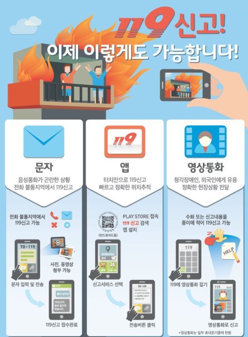 Àüȸ¦ ÅëÇÑ 119 ½Å°í°¡ ¾î·Á¿î °æ¿ì 119´Ù¸Åü ½Å°í¼ºñ½º¸¦ ÅëÇØ ½Å°íÀÚ¿Í 119»óȲ¿ä¿ø °£ ¿µ»óÅëÈ´Â ¹°·Ð ¹®ÀÚ¿Í À¥À¸·Îµµ ½Å°í°¡ °¡´ÉÇØ û°¢Àå¾ÖÀÎ µî ÀÇ»ç¼ÒÅëÀÌ ¾î·Æ°Å³ª À½¼ºÅëȰ¡ °ï¶õÇÑ °æ¿ì ±ä±Þ»óȲÀ» Àü´ÞÇÒ ¼ö ÀÖµµ·Ï Çß´Ù.