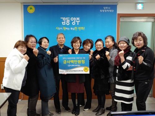 ¾çÁֽà Èñ¸ÁÀåÇÐÀç´Ü(ÀÌ»çÀå ÀÓÃæºó)Àº Áö³ 6ÀÏ »ç´Ü¹ýÀÎ °æ±âµµ¿©¼º´ÜüÇùÀÇȸ ¾çÁÖ½ÃÁöȸ(ȸÀå ¹æ±â¼÷) °ü°èÀÚµéÀÌ ÀåÇбâ±Ý 4¹é¸¸¿øÀ» ±âºÎÇß´Ù°í ¹àÇû´Ù.