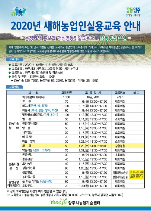 ¾çÁÖ½Ã(½ÃÀå À̼ºÈ£)´Â ³»³â 1¿ù6ÀϺÎÅÍ 31ÀϱîÁö ³ó¾÷±â¼ú¼¾ÅÍ¿Í ÀåÈï³óÇù¿¡¼ ÃÑ 20ȸ¿¡ °ÉÄ£ ‘2020³â »õÇØ³ó¾÷Àνǿ뱳À°’À» ½Ç½ÃÇÑ´Ù.