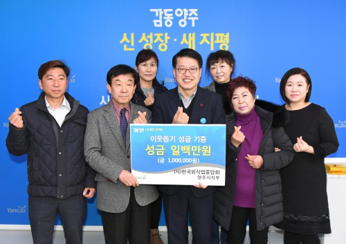 »ç´Ü¹ýÀÎ Çѱ¹¿Ü½Ä¾÷Áß¾Óȸ °æ±âµµÁöȸ ¾çÁÖ½ÃÁöºÎ´Â 19ÀÏ ¾çÁÖ½ÃûÀ» ¹æ¹®ÇØ °ü³» ¾î·Á¿î ÀÌ¿ô°ú Èñ¸ÁÀ» ³ª´©°íÀÚ ¼º±Ý 1¹é¸¸¿øÀ» Àü´ÞÇß´Ù.