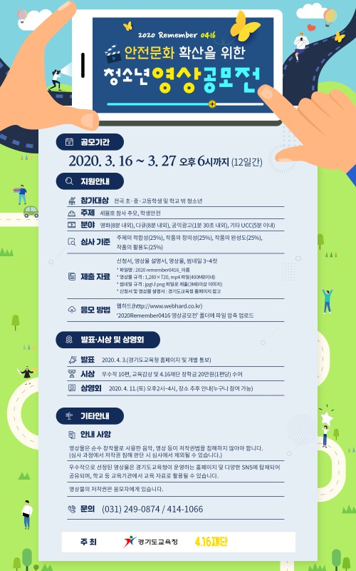 °æ±âµµ±³À°Ã»(±³À°°¨ ÀÌÀçÁ¤)ÀÌ ¼¼¿ùÈ£ Âü»ç 6Áֱ⸦ ¸Â¾Æ Èñ»ýÀÚ¸¦ Ã߸ðÇÏ°í ¾ÈÀü¹®È¸¦ È®»êÇϱâ À§ÇØ 4.16Àç´Ü°ú ÇÔ²² ‘2020 Remember 0416 û¼Ò³â ¿µ»ó°ø¸ðÀü’À» ÁøÇàÇÑ´Ù°í 3ÀÏ ¹àÇû´Ù.