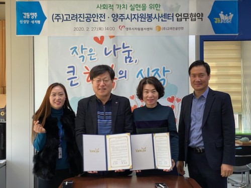 ¾çÁÖ½ÃÀÚ¿øºÀ»ç¼¾ÅÍ(¼¾ÅÍÀå ¹ÚÁ¾¼º)´Â ¢ß°í·ÁÁø°ø¾ÈÀü(´ëÇ¥ ±è±¤ÀÚ)°ú ÀÚ¿øºÀ»ç Ȱ¼ºÈ¸¦ ÅëÇÑ »çȸÀû °¡Ä¡½ÇÇöÀ» À§ÇØ ¾÷¹«Çù¾àÀ» ü°áÇß´Ù°í ¹àÇû´Ù.