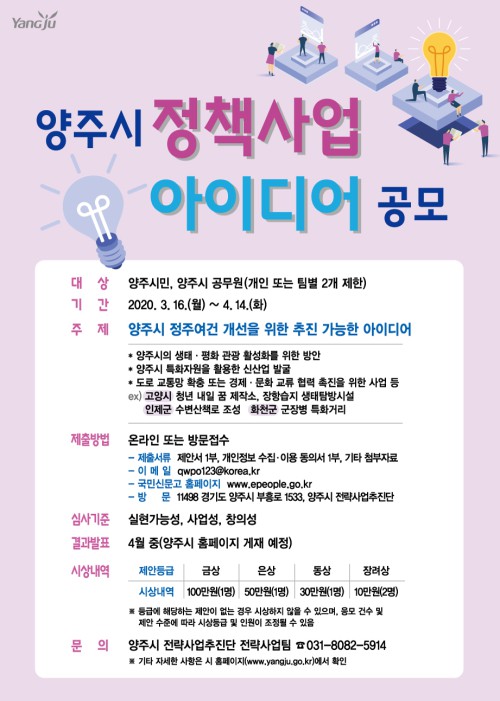 ¾çÁÖ½Ã(½ÃÀå À̼ºÈ£)´Â ¿À´Â 4¿ù14ÀϱîÁö Á¤ÁÖ¿©°Ç °³¼±À» À§ÇÑ ½Ã¹ÎÀÇ Çõ½ÅÀûÀÎ Á¤Ã¥»ç¾÷ ¾ÆÀ̵ð¾î¸¦ Á¢¼öÇÑ´Ù.