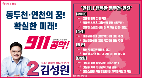 ±è¼º¿ø ±¹È¸ÀÇ¿ø(¹Ì·¡ÅëÇÕ´ç, µ¿µÎõ‧¿¬Ãµ)ÀÌ Á¦21´ë ±¹È¸ÀÇ¿ø ¼±°Å 911 °ø¾à(5´ë ºÐ¾ß 91°³ 1(ÀÏ)ÇÏ´Â °ø¾à) º¹Áöȯ°æ ºÐ¾ß ¼Ò½Ã¹ÎÀÇ Çູ°ú Á÷´É´Üü Áö¿øÀ» À§ÇÑ ‘¾ðÁ¦³ª ÇູÇÑ µ¿µÎõ·¿¬Ãµ’ ºÐ¾ß °ø¾àÀ» ¹ßÇ¥Çß´Ù.