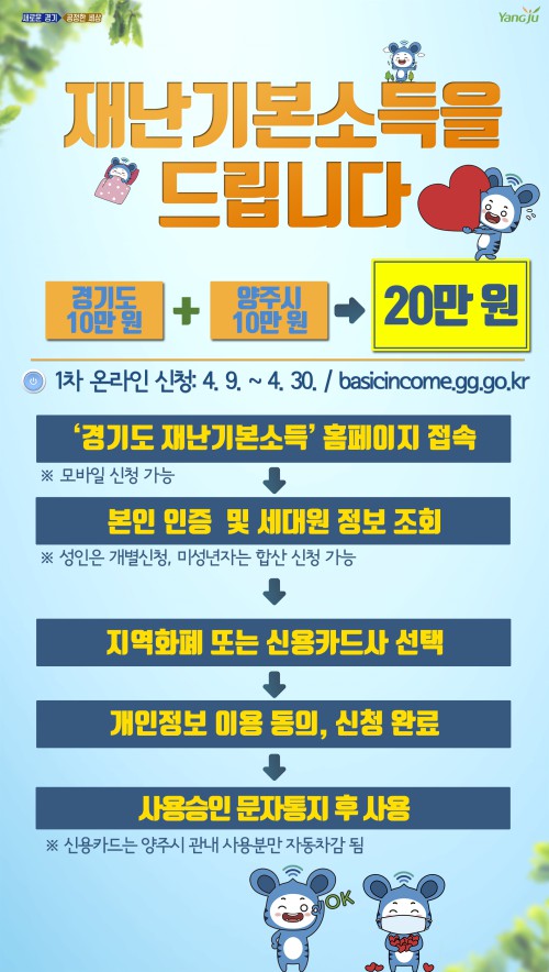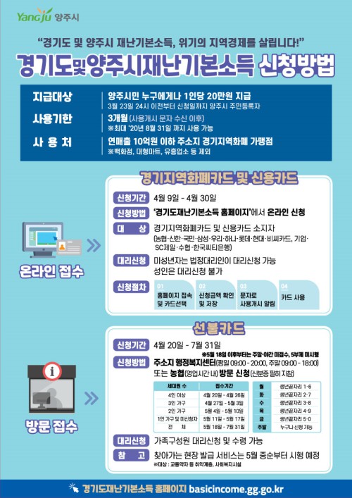 ¿Â¶óÀÎ ½ÅûÀº 4¿ù9ÀϺÎÅÍ 4¿ù30ÀϱîÁö ¾çÁÖ»ç¶ûÄ«µå³ª ½Å¿ëÄ«µå ¼ÒÁöÀÚ¸¦ ´ë»óÀ¸·Î °æ±âµµÀ糱⺻¼Òµæ ȨÆäÀÌÁö(basicincome.gg.go.kr)¿¡¼ ÁøÇàÇÑ´Ù.