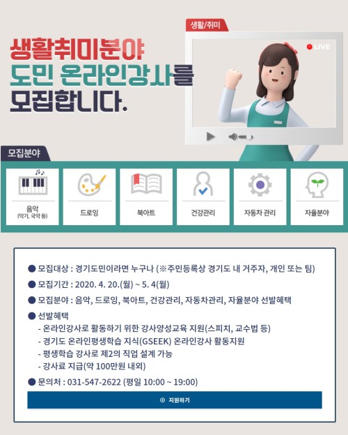 ¸ðÁýºÐ¾ß´Â »ýȰÃë¹Ì°ü·Ã À½¾Ç·µå·ÎÀ×·ºÏ¾ÆÆ®·°Ç°°ü¸®·ÀÚµ¿Â÷°ü¸®·ÀÚÀ²ºÐ¾ß µî 6°³·Î, ÇØ´çºÐ¾ß¿¡ ÀڽŸ¸ÀÌ °®°í ÀÖ´Â ¹æ¹ýÀ̳ª Áö½ÄÀÌ ÀÖ´Â °æ±âµµ¹ÎÀ̶ó¸é °³ÀÎ ¶Ç´Â ÆÀ ´ÜÀ§·Î ´©±¸³ª ½Åû°¡´ÉÇÏ´Ù.