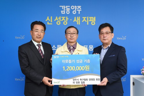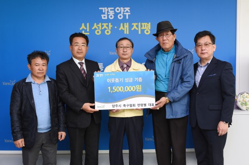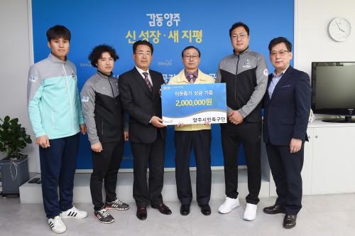 ¾çÁÖ½Ã(½ÃÀå À̼ºÈ£)´Â Áö³ 23ÀÏ ¾çÁֽà Ã౸Çùȸ(ȸÀå ¾ç¿µÃ¢)¿¡¼ ½ÃûÀ» ¹æ¹®, Äڷγª19 Á¶±â±Øº¹À» À§ÇØ ¼º±Ý 530¸¸¿øÀ» ±âºÎÇß´Ù°í ¹àÇû´Ù.