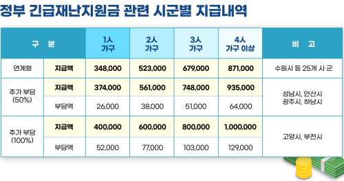 ¿¹¸¦ µé¾î ´Ù¸¥ ½Ãµµ 1ÀÎ °¡±¸ÀÇ °æ¿ì Á¤ºÎ ±ä±ÞÀç³Áö¿ø±ÝÀÌ 40¸¸¿ø ±Ô¸ðÀÎ ¹Ý¸é, °æ±âµµ³» 1ÀÎ °¡±¸´Â °æ±âµµ¿Í ½Ã±º, Á¤ºÎÁö¿ø±Ý±îÁö ¸ðµÎ ÇÕ»êÇØ 49¸¸~84¸¸¿øÀ» ¼ö·ÉÇÏ´Â ±¸Á¶´Ù. 4ÀÎ °¡±¸·Î µûÁö¸é Á¤ºÎ ±ä±ÞÀç³Áö¿ø±ÝÀÌ 100¸¸¿ø ±Ô¸ðÁö¸¸, °æ±âµµ³» 4Àΰ¡±¸ÀÇ ½Ç ¼ö·É¾×Àº 147~287¸¸¿øÀÌ µÈ´Ù.