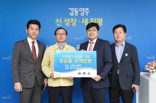 ¾çÁÖ½Ã(½ÃÀå À̼ºÈ£)´Â 13ÀÏ °ü³» ¼ÒÀç ÀüÀÚÀú¿ï ¾÷üÀÎ ¢ßÄ«½º(´ëÇ¥ÀÌ»ç ±èÅÂÀÎ)¿¡¼ ¾çÁÖ½ÃûÀ» ¹æ¹®, °ü³» ¾î·Á¿î ÀÌ¿ôÀ» À§ÇØ ½á´Þ¶ó¸ç ¼º±Ý 100¸¸¿ø°ú 400¸¸¿ø »ó´çÀÇ ÀüÀÚÀú¿ïÀ» Àü´ÞÇß´Ù°í ¹àÇû´Ù.