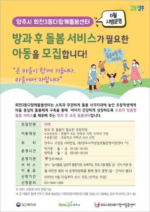 ¾çÁÖ½Ã(½ÃÀå À̼ºÈ£)°¡ ¿À´Â 22ÀϺÎÅÍ ¹æ°ú ÈÄ Ãʵº½ »ç°¢Áö´ë ÇØ¼Ò¸¦ À§ÇØ È¸Ãµ3µ¿ ¾çÁֽÿ©¼ºÀÏ»ýȰ±ÕÇüÁö¿ø¼¾ÅÍ ³»¿¡ ´ÙÇÔ²²µ¹º½¼¾ÅÍ 1È£Á¡À» ½Ã¹ü ¿î¿µÇÑ´Ù.