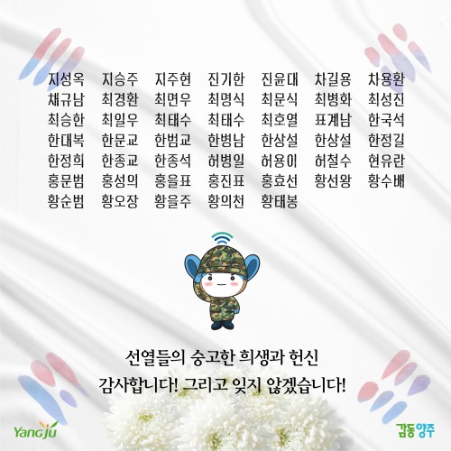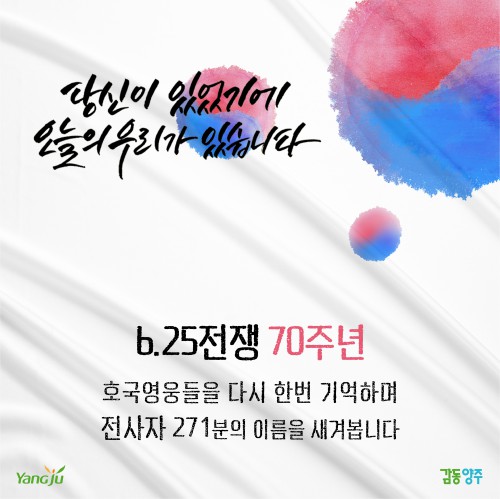 À̼ºÈ£ ¾çÁÖ½ÃÀåÀº “6·25ÀüÀï 70ÁÖ³âÀ» ¸Â¾Æ ½Ã¹Î°ú ÇÔ²² È£±¹¿µ¿õµéÀÇ °í±ÍÇÑ Çå½ÅÀ» ±â¸®°íÀÚ Á¦ÀÛÇÑ ¿µ»óÀ» ¾çÁֽà °ø½Ä À¯Æ©ºê, SNS µî¿¡ °Ô½ÃÇß´Ù”¸ç “Á¶±¹ ¼öÈ£¸¦ À§ÇØ Àå·ÄÈ÷ »êÈÇÑ 6.25 Àü»çÀÚ¿Í º¸ÈÆ °¡Á·ÀÌ Á¸°æ¹ÞÀ» ¼ö ÀÖµµ·Ï ¿¹¿ì¿Í Áö¿ø¿¡ ´õ¿í ÃÖ¼±À» ´ÙÇϰڴٔ°í ¸»Çß´Ù.