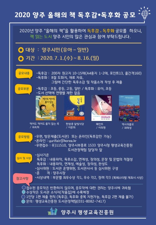 ¾çÁÖ½Ã(½ÃÀå À̼ºÈ£)´Â ¿À´Â 7¿ù1ÀϺÎÅÍ 8¿ù16ÀϱîÁö 2020 ¾çÁÖ ‘¿ÃÇØÀÇ Ã¥’À» ´ë»óÀ¸·Î µ¶Èݨ·µ¶ÈÄÈ °ø¸ðÀüÀ» °³ÃÖÇÑ´Ù.