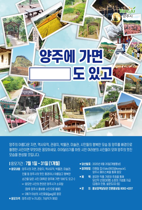 ‘¾çÁÖ¿¡ °¡¸é 000µµ ÀÖ°í’´Â ¾çÁÖÀÇ ÀÚ¿¬, °ü±¤Áö, ¿ª»çÀ¯Àû, ¹Ú¹°°ü, ¹Ì¼ú°ü Àι° µî ¾çÁÖ¸¦ ¹è°æÀ¸·Î ÇÑ ¸ÚÁø dz°æÀ̳ª ¾Æ¸§´ä°í ÇູÇÑ ¼ø°£À» ´ãÀº »çÁøÀ» °ø¸ðÇÑ´Ù.